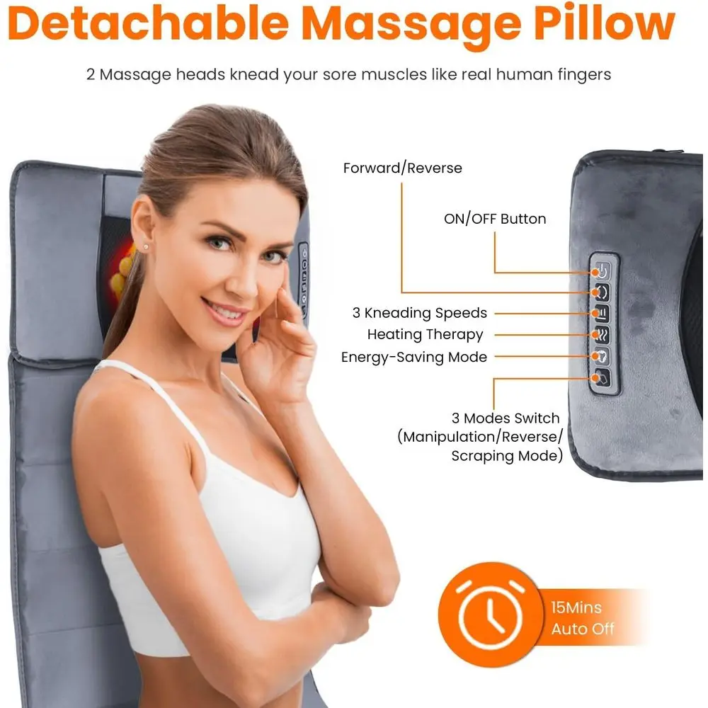 Detachable Massage Pillow: Equipped with 2 shiatsu nodes that mimic human finger techniques (grasping/kneading/pressing) to relieve neck stiffness. Choose from bidirectional rotation or 3 specialized modes with 3 speed options. Built-in heating accelerates neck blood circulation.
