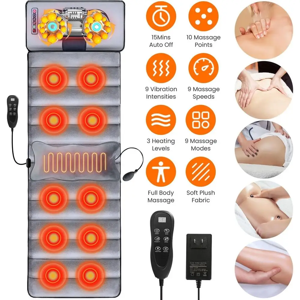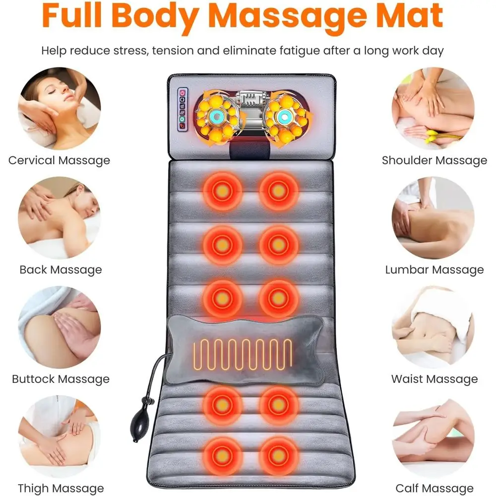 Full Body Massage Mat with Thickened Pillow Cloth and Elastic Fixing Buckle Straps: This intelligent mat features 10 rotating massage heads targeting back, buttocks, waist, thighs, and calves. It offers full immersion through 9 massage modes, 9 vibration intensities, 9 speed levels, and 3 heating levels. It effectively reduces stress, tension, and fatigue after long workdays. Customizable modes provide personalized therapy, ensuring comprehensive body coverage.