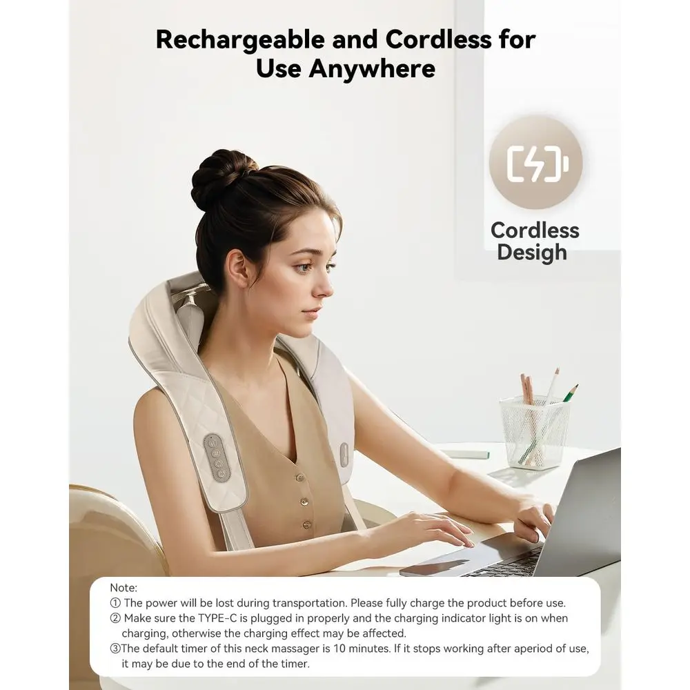 Large Capacity Battery & Portable Durability: With daily use, this cordless massager lasts up to a week on a single charge. Featuring USB Type-C charging, it works wirelessly without being tethered to an outlet, letting you enjoy relaxing massages anytime, anywhere. The compact size of the massager makes it easily portable, fitting into regular-sized travel bags, gym bags, or carry-ons.