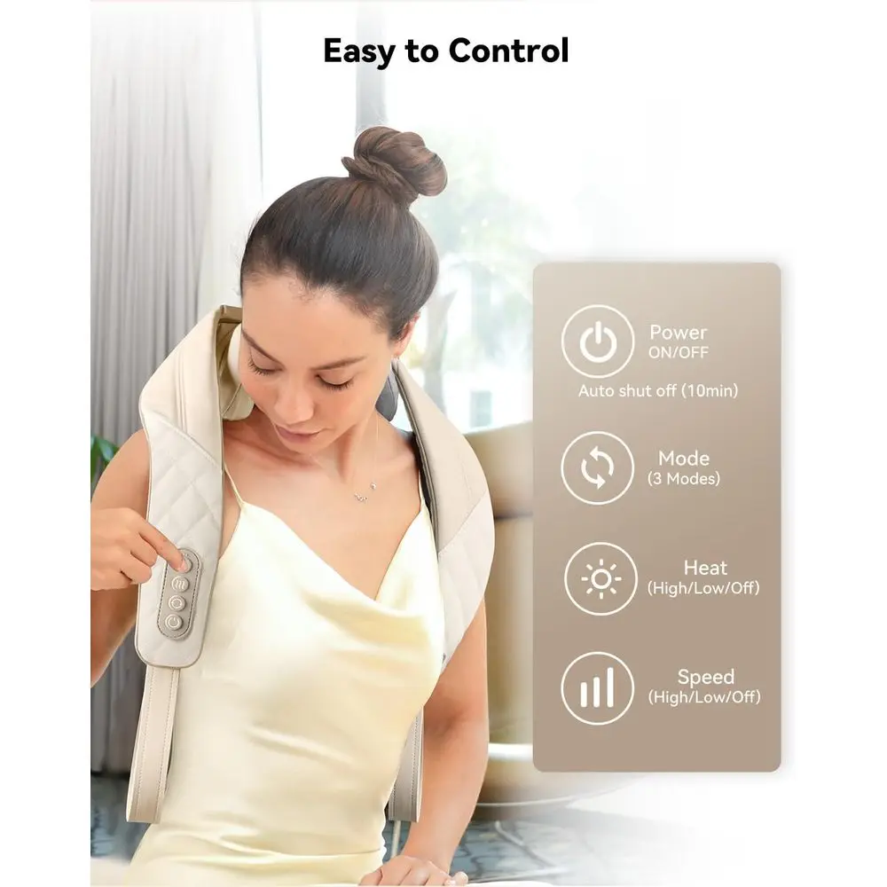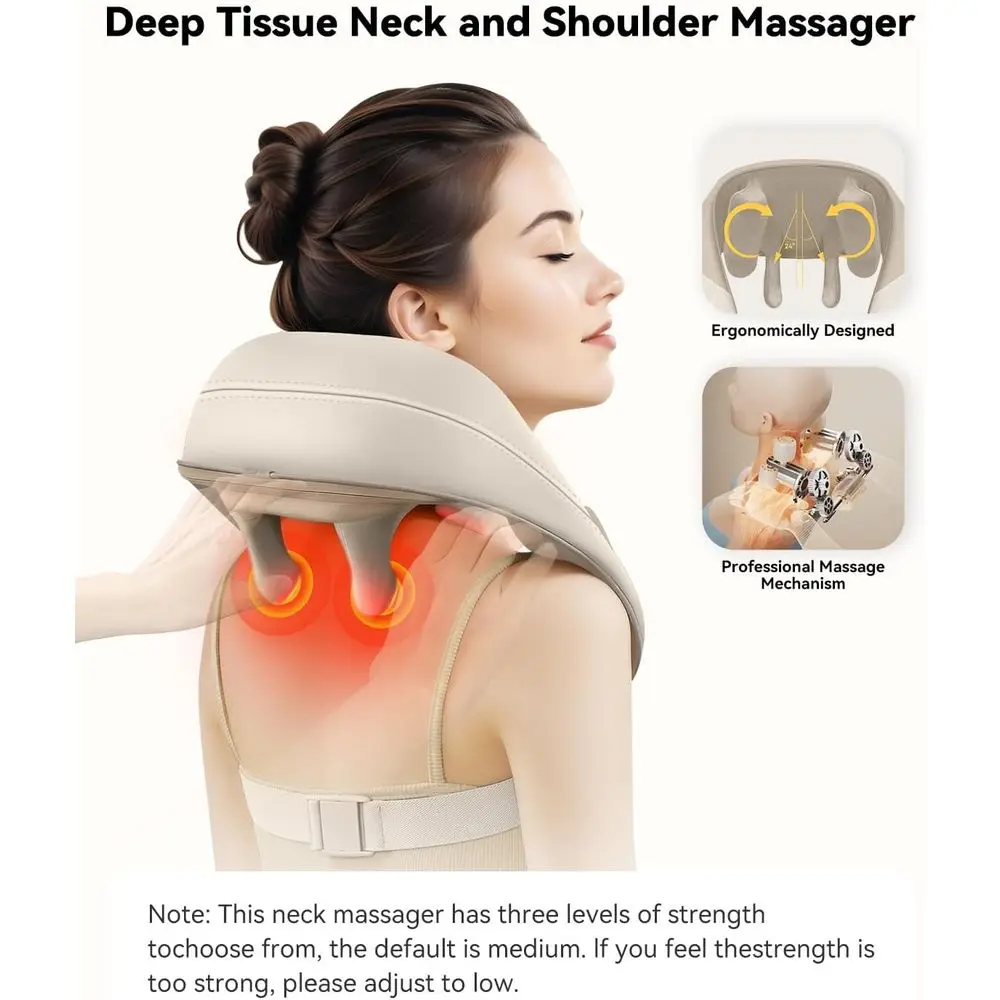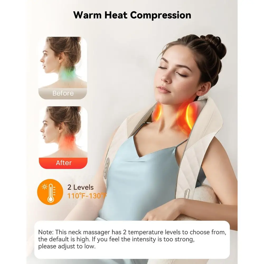 Simulated Human Hand Design: The upgraded massager utilizes kneading shiatsu massage technology that mimics real masseur hand movements to deeply improve muscle tension. From the neck to the trapezius and shoulders, its six massage nodes simulate real human kneading, pressing, rolling, and patting techniques, reducing stress and clearing muscle knots. Two adjustable massage intensity levels are available to suit your needs.